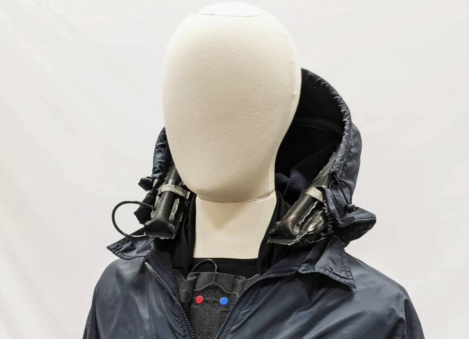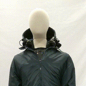 他们用柔软的小管子将气囊连接起来,并将它们嵌入夹克中。按下夹克上的按钮,就可以控制空气从装有二氧化碳的罐中流过这些气囊。气囊折叠和展开形成扭结,使帽子上的动力气囊充气或放气,让帽子戴上或者摘下。