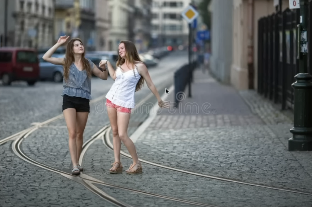 首先使用图像到文本模型nlpconnect/vit-gpt2-image-captioning进行图像描述,生成的文本「2个女人在有火车的街道上行走」。