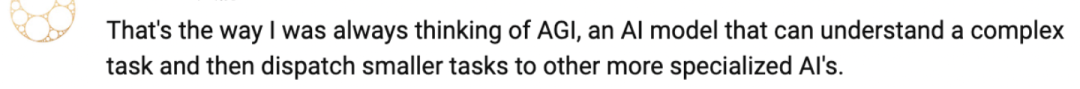 这就是我一直以来对AGI的看法,人工智能模型能够理解复杂任务,然后将较小的任务分派给其他更专业的AI模型。