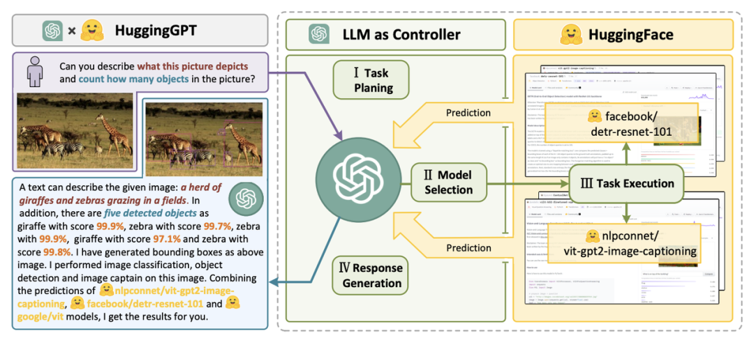 可以看到HuggingGPT是如何将它拆解为6个子任务,并分别选定模型执行得到最终结果的。