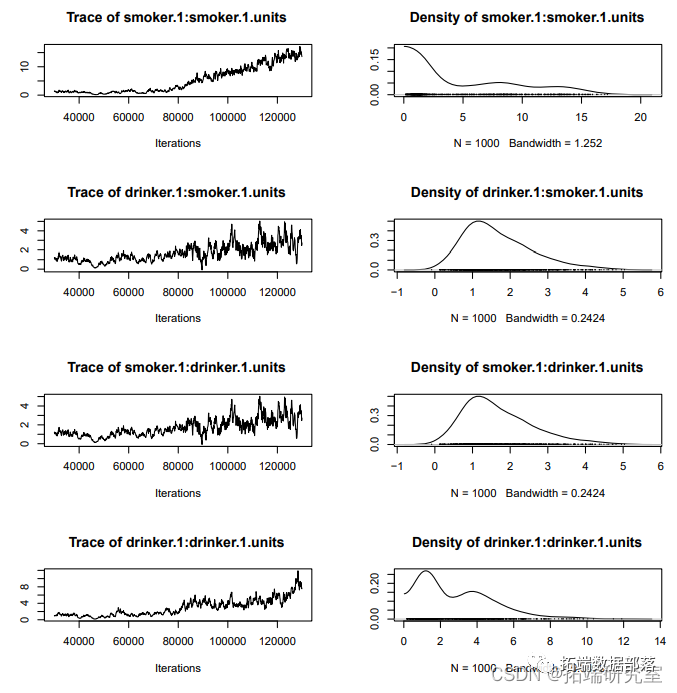 正相关表明,在这个双变量模型中,喜欢吸烟的人更可能是饮酒者。
