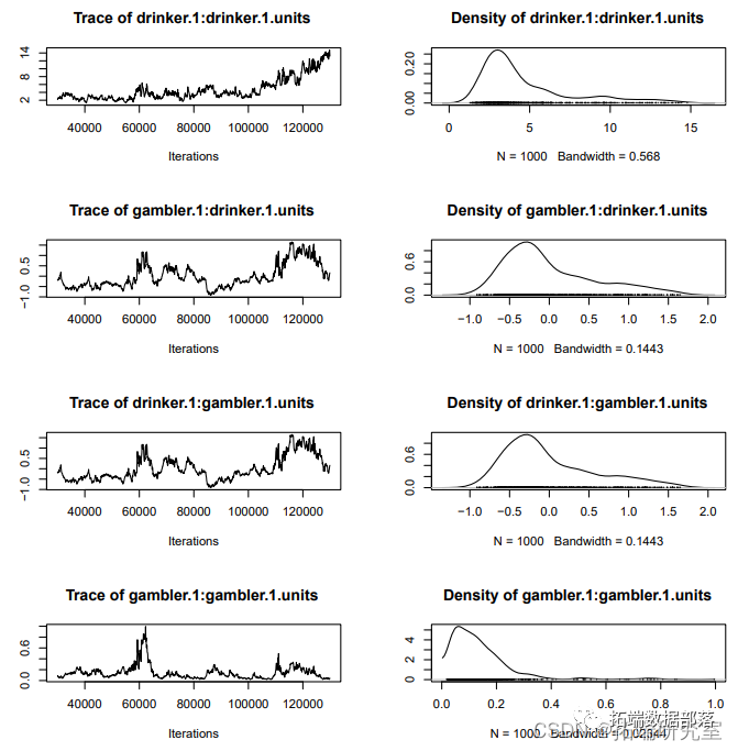 在这一节中,吸烟、喝酒和赌博的数据将在单变量模型中被拟合。以下是来自R的结果。