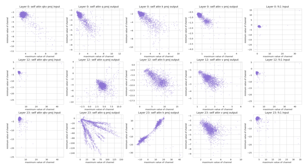 图 1 不同通道的数值分布情况。每个点都代表一个激活通道中的 (最大值,最小值)。