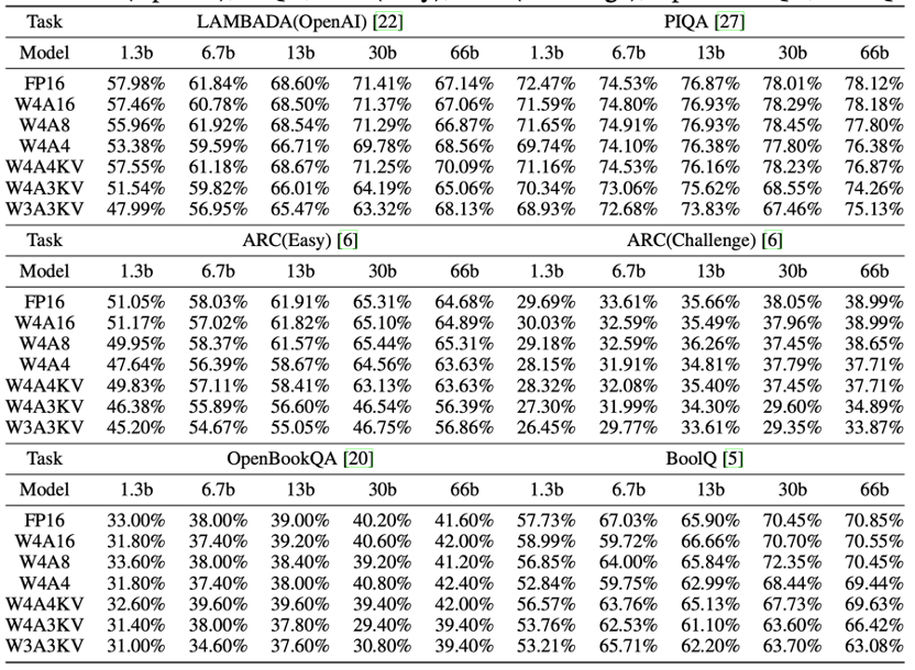 作者在三种不同的位宽配置下评估了 OPT 的性能:W4A16、W4A8 和 W4A4。此外,作者还开发了一种新的量化方案,W4A4KV、W4A3KV 和 W3A3KV,只对主要内存的消耗 —— 键缓存和值缓存(Key/Value Cache)进行量化。根据表格,可以得出以下观察结果:一般而言,随着激活量化位宽的减少,模型的性能会下降。但在大多数情况下,这种退化并不显著。对于某些任务,性能下降不到 1%,甚至有所提高。