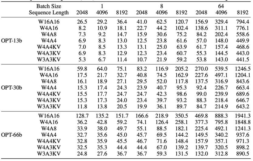 表中展示了不同设置下的内存使用情况,可以发现较低比特的激活可以显著减少内存使用,特别是在批次大小和序列长度较大的情况下。具体而言,当批次大小为 64,序列长度为 8192 时,OPT-66b 下的 W4A4 配置相比 W4A16 配置节省了超过 900GB 的内存。因此,采用 RPTQ 对激活量化可以极大地减少在长文本任务或大批量场景中的内存压力。