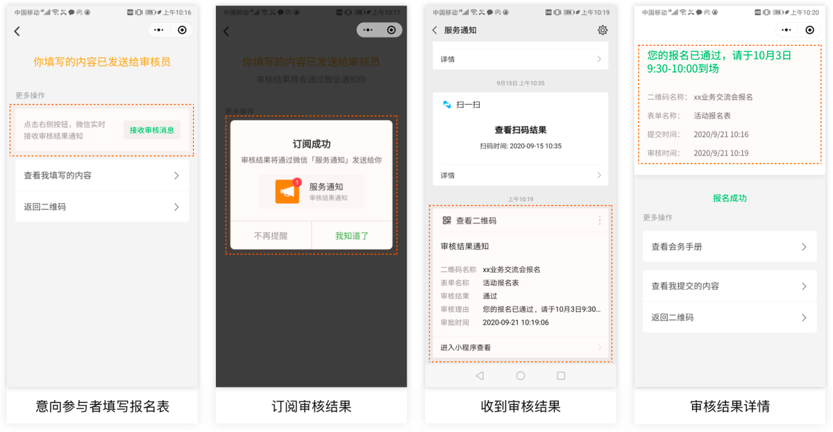对于需要审核报名者资格的会议或活动,可以开启审核功能,由指定人员在手机端或电脑登录后台完成审核,报名者将接收到组织方对本次报名的审核反馈