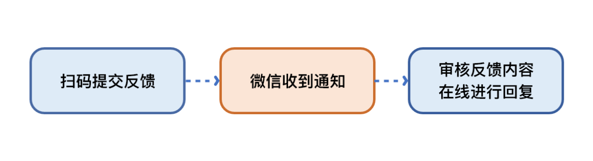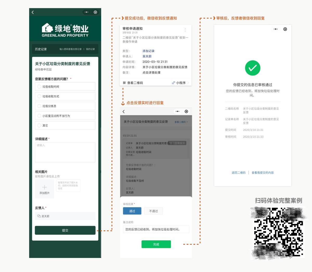 除此之外,传统纸质留言板需要用笔进行填写,反馈意见费时费力,相关单位收到反馈意见后也无法直接进行回复。将留言建议的记录单制作成二维码,放在布告栏等位置,业主/消费者等可以扫描二维码随时随地进行反馈,相关单位可以通过微信实时接受反馈意见,还可在线进行回复。