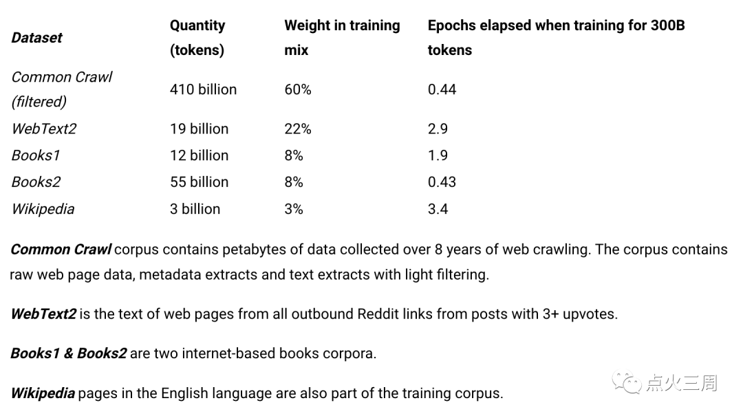 从GPT-3的训练数据,我们就可以看到60%来自于网络爬虫爬取的通用互联网数据中提取出的文字部分。以及22%来自原一些问答网站,比如Reddit、Stack overflow的3星以上的帖子。最后才是电子书和维基百科。
