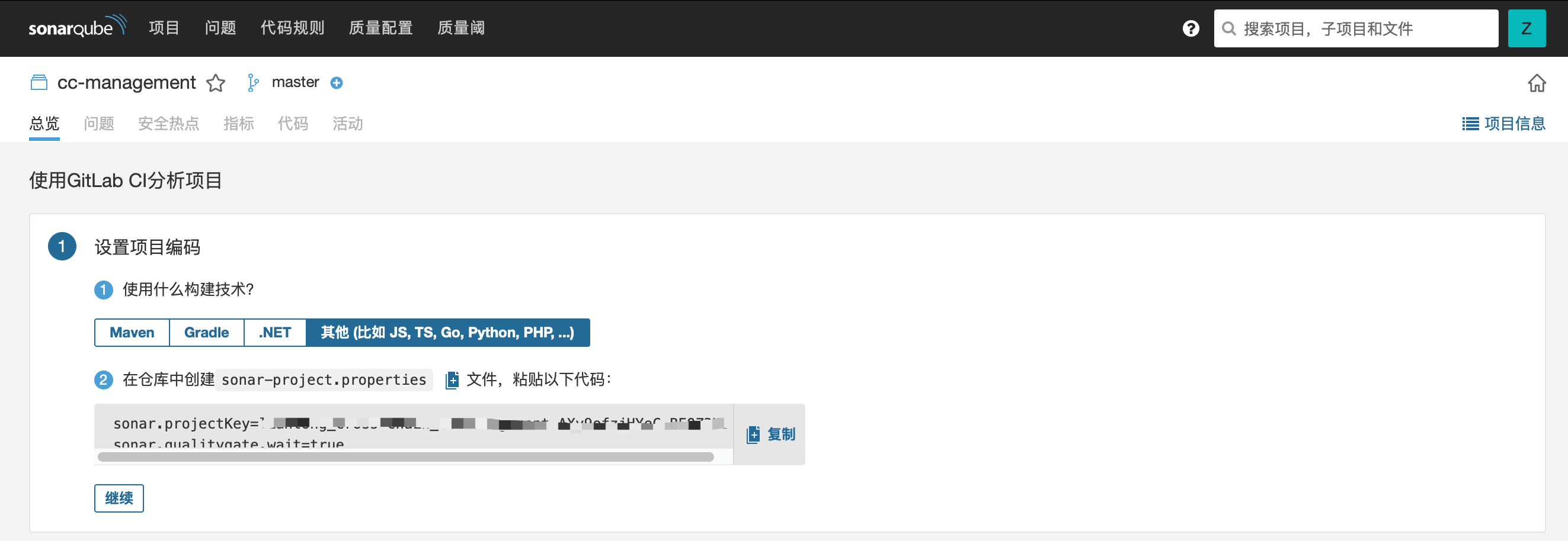 以 Go 项目为例,首先,我们需要按照提示手动创建 sonar-project.properties 文件并粘贴配置信息。