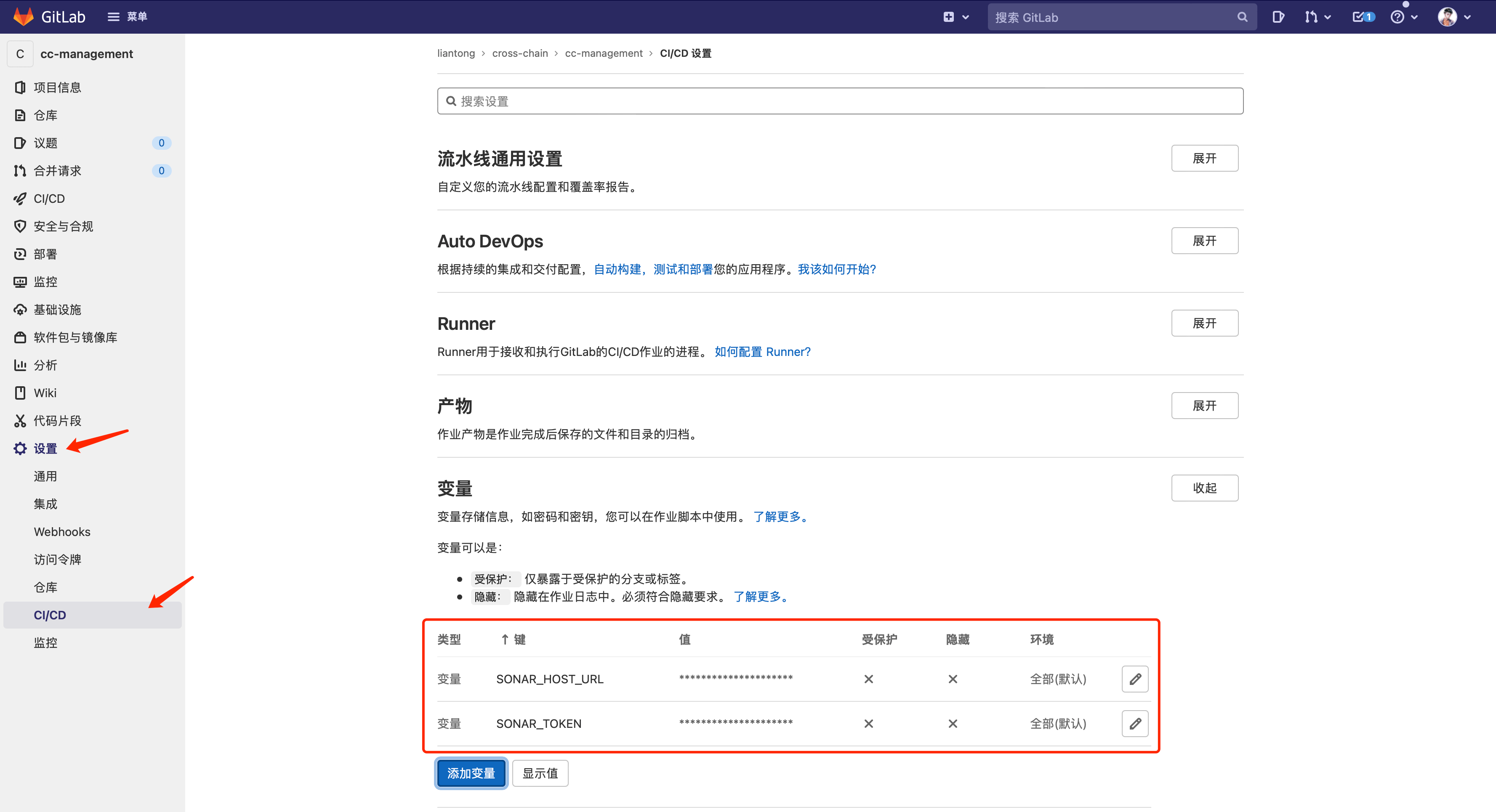 然后需要为项目创建 Token,并在 GitLab 中 「设置」-「CI/CD」-「变量」配置选项中填写 Token 及 URL 变量值。