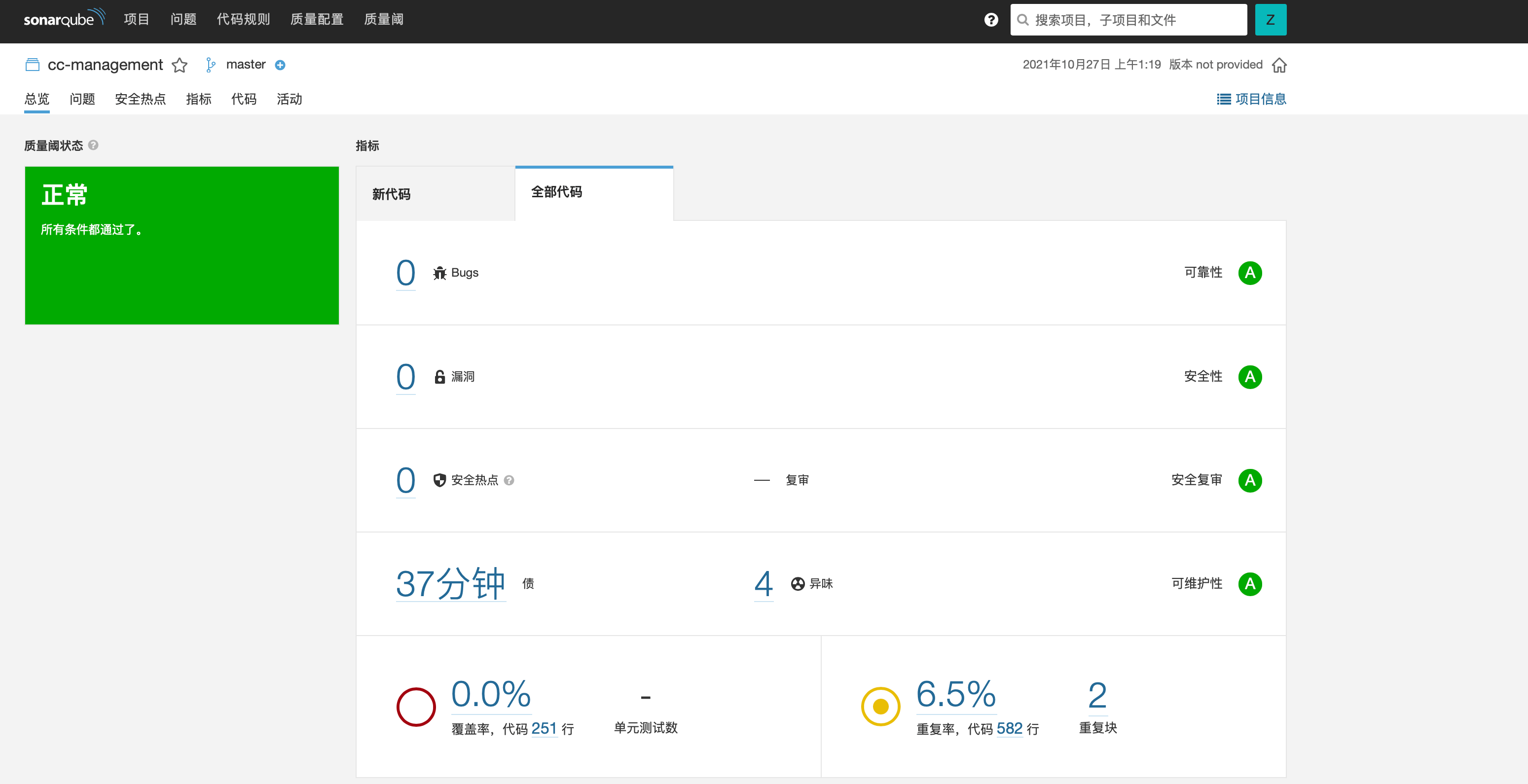 此时点开 SonarQube 中项目的页面,则已经有了分析信息,本次代码质量检查完成。