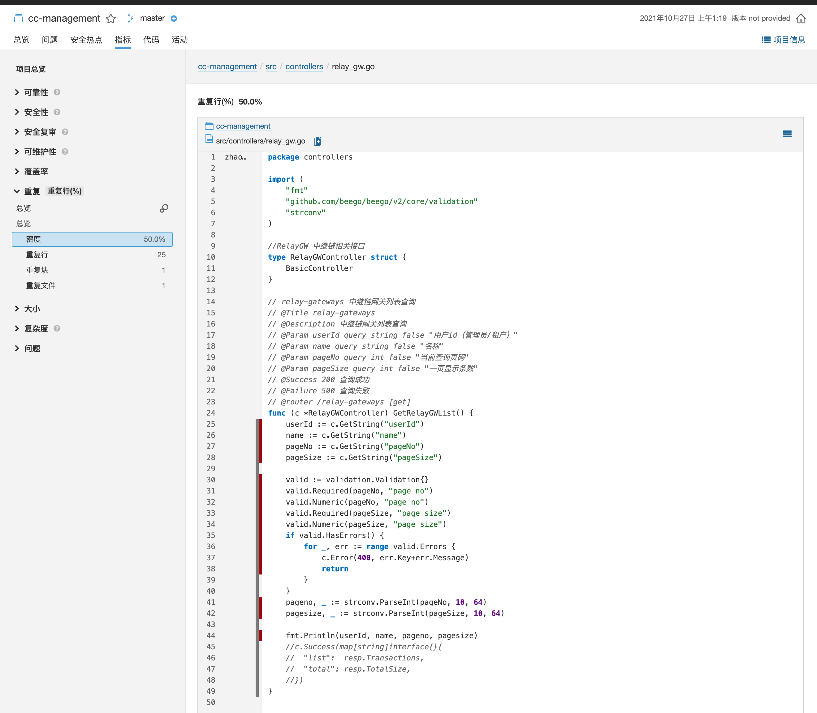 点击具体指标则可以深入代码文件对检测出的问题进行标识,为人工 code review 提供了有效参照。