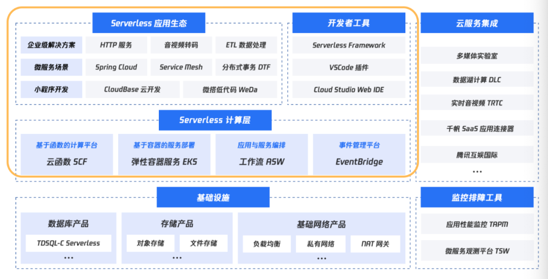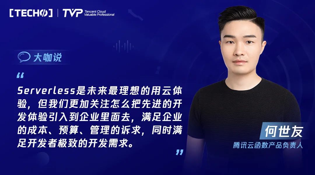 Serverless 架构市场规模持续增长,函数 SCF 已累计服务 200 万开发者,次日均调用量超过 300 亿。何老师还详细介绍了用 Serverless 产品打造的满足企业和开发者需求的研运平台。