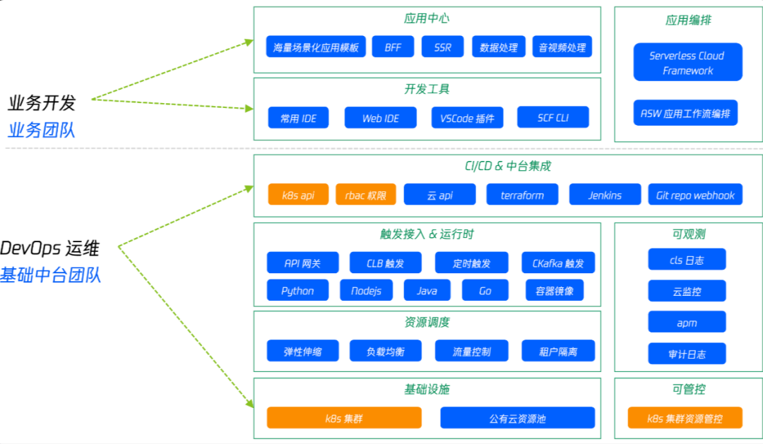 腾讯云也将腾讯内部研效治理的经验凝练为技术能力,助力更多企业提升研效。在基础设施层,腾讯云原生团队积极探索 Serverless 化,打造面向未来的应用研发交付体系和用云体验,实现开发云原生资源服务化;在基础软件层,腾讯云数据库团队研发打磨出 TDSQL,大幅度提升数据库性能,满足对弹性、高可用性、可扩展性的需求;在研发环节,推出了远程协作的云端 IDE—腾讯云 Cloud Studio,并将WebIDE 与 DevOps 能力打通,连接云上开发资源环境,优化云端开发协作体验;在运维层面,腾讯云监控推出了一体化可观测平台,打通监控产品的数据孤岛,覆盖 App、分布式应用、容器等不同场景,有效提高监控运维效率,并将其观测能力融合到云原生应用管理能力,让技术团队能够充分享受云原生技术红利;腾讯安全团队对传统的开发安全工具进行颠覆式的创新,提供云上数据资产安全防控能力,形成了完善的 DevSecOps 体系建设。