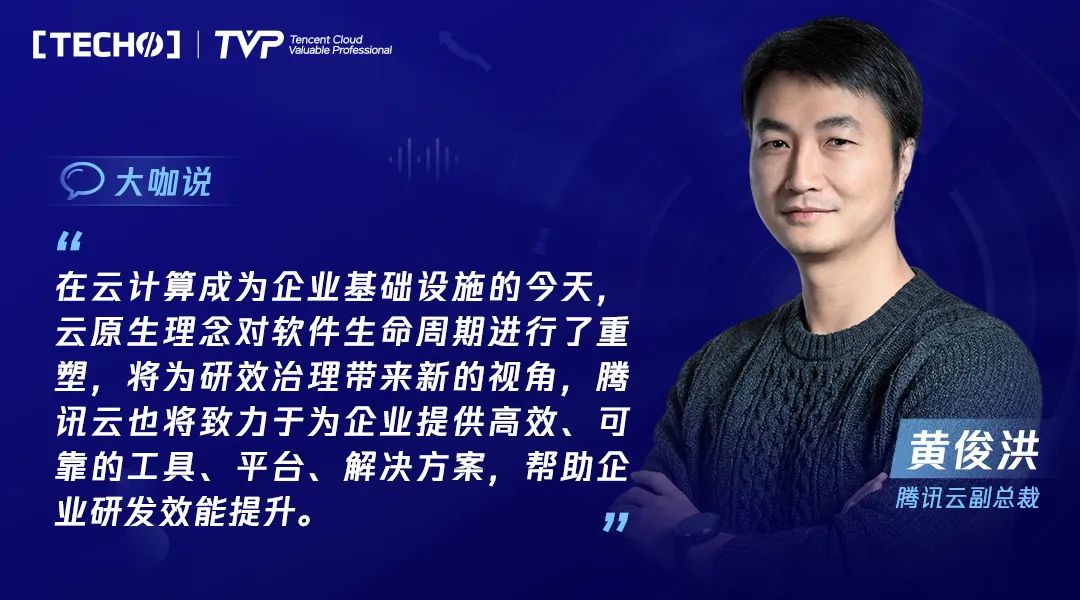 腾讯云副总裁 黄俊洪为本次峰会发表了致辞。他首先回顾了腾讯内部持续进行研发效能治理的历史,从 2019 年腾讯内部上云开始,研发流程 DevOps 化就是很重要的一项工作。通过研发数据资产治理以及持续交付流水线改造,再配合容器化和微服务框架改造,最终在 2022 年实现了腾讯自研业务全面上云。