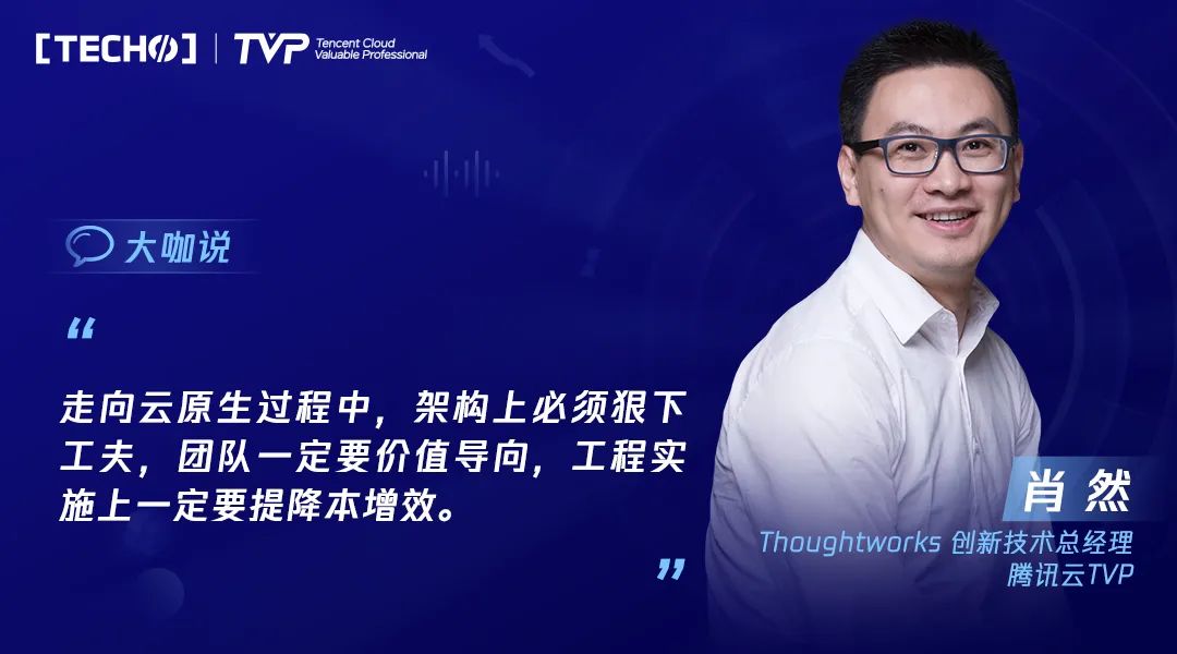 肖老师提出了三个口号:一是架构上必须狠下工夫,云原生不是让大家把现有的东西直接搬到云容器里面去,这个叫上云,不叫云原生。所以架构上一定要狠下工夫。二是团队一定要价值导向,接下来团队会更加碎片化、更小,但一定要保证价值导向,要不然就会出问题。三是在工程实施上一定要提降本增效。真正想走进云原生,也要提降本增效,不要羞于提,今年如果花 100 万,明年花 90 万就是胜利,这对企业来说就是真金白银。