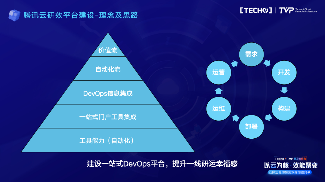 他用金字塔模型分享了整个腾讯云研效平台的理念和思路。最终的目标是要实现从需求、开发、构建到最终的运维运营,一体式全过程地在研效平台上完成,提升一线研发和运维的幸福感。第一阶段是金字塔最底层各种工具能力的完善,把已有的主流的工具挑选出来,然后去完善其能力,尤其是加强自动化方面。再往上是通过一站式门户把工具串联起来,从需求提出到代码管理再到最后上线发布和监控运维,都在这个平台上完成,这是第二阶段。第三阶段是在此之上实践 DevOps 理念,尤其是从应用视角来贯穿流程。最上层是价值体现,这也是希望研效工作最终达到的目标,也就是希望通过数据度量跟踪,体现所有的研效提升工作确实符合预期,确实按照所设想的轨道往前推进。