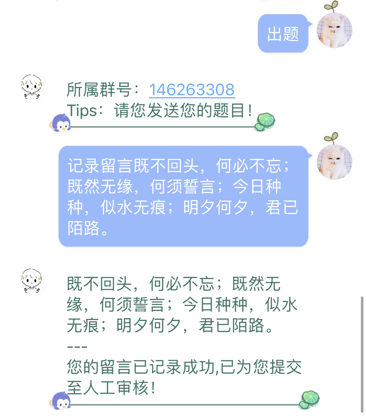 私聊发送 出题 ,根据提示进行操作即可,等待管理员通过后即可获取相应的积分奖励,题目将展示在答题中。