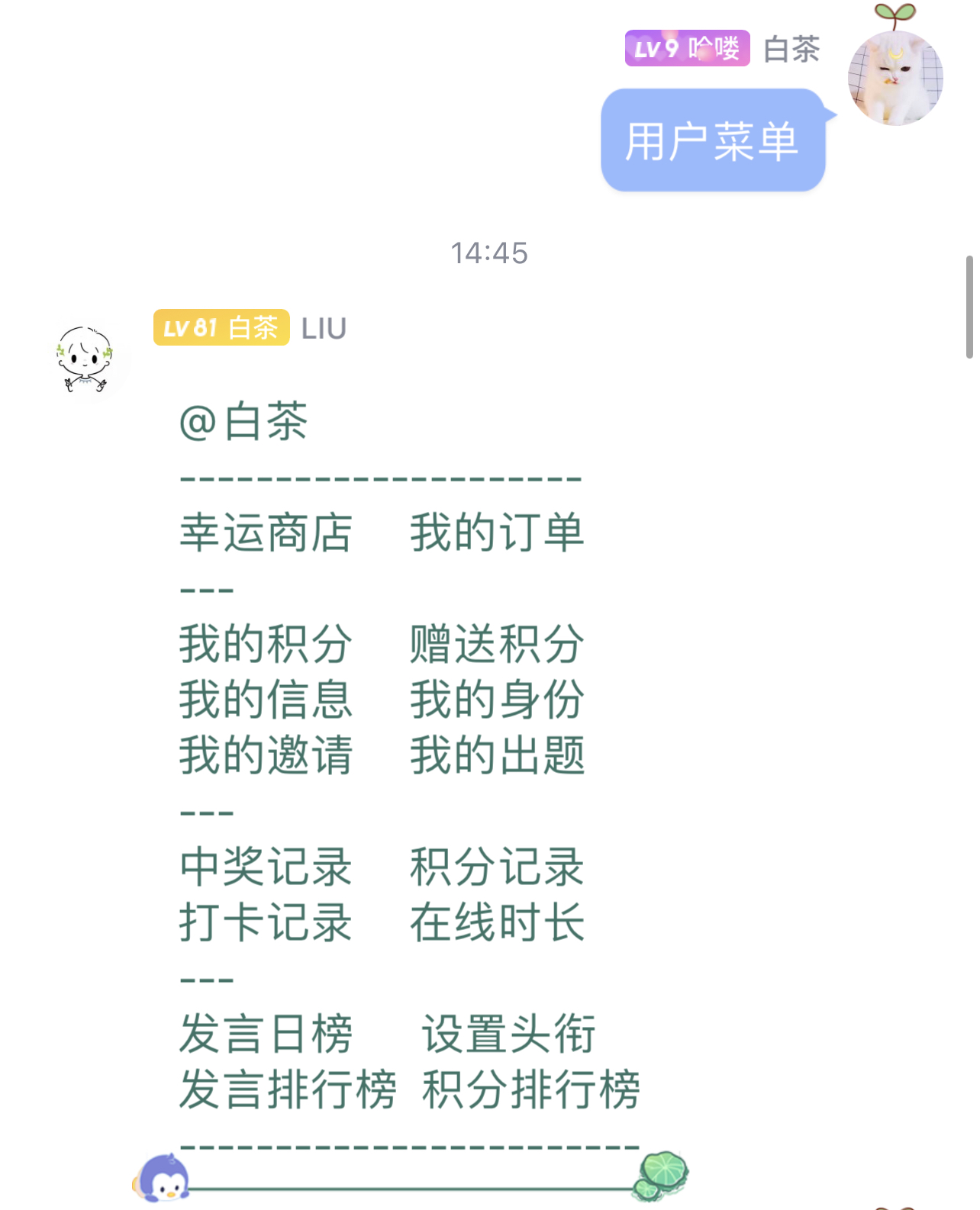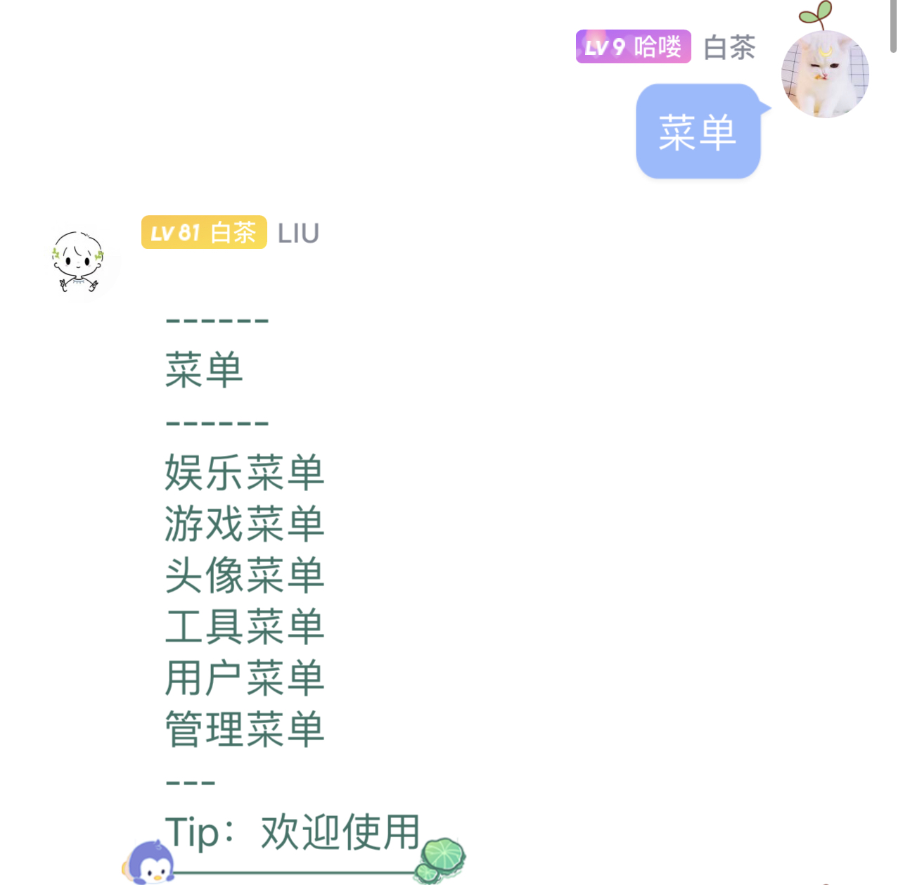 Tips:更多功能可以发送用户菜单查询