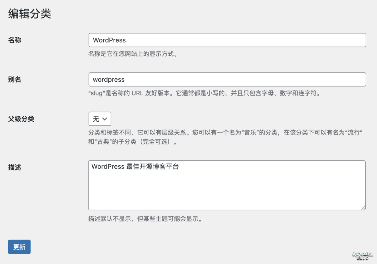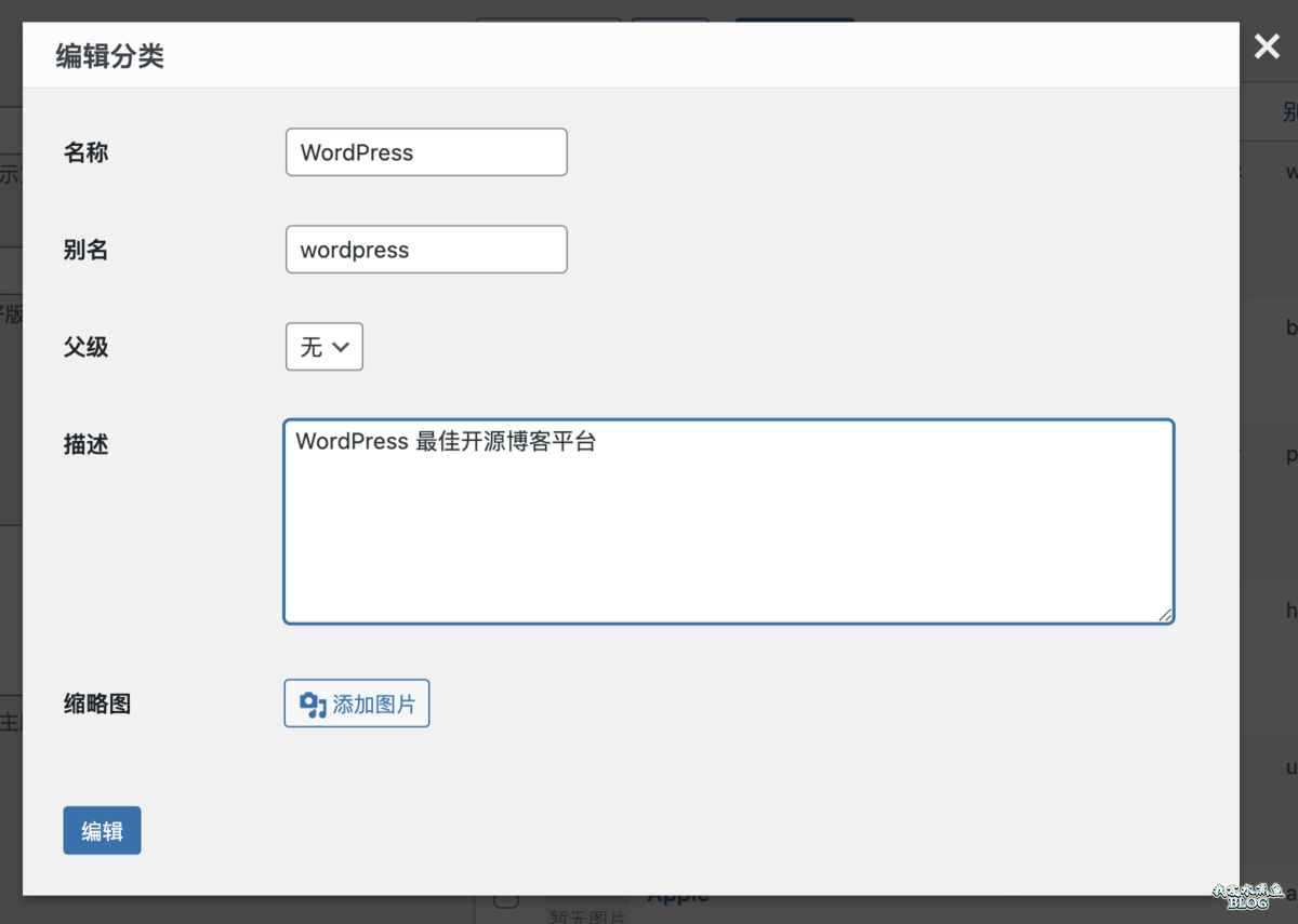 点击「编辑」按钮就是进入 WordPress 分类的编辑页面:
