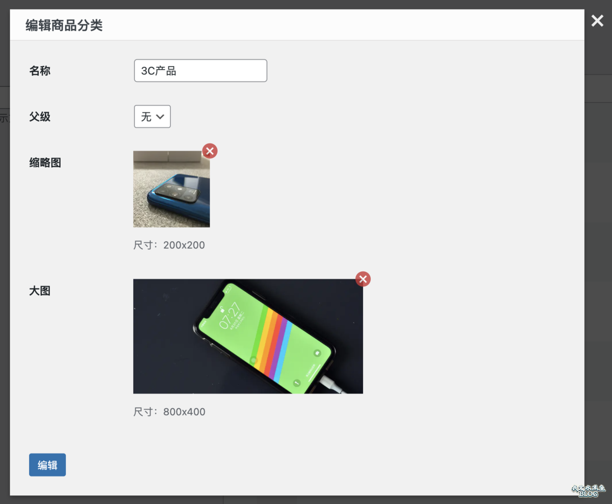 当然这个分类信息编辑弹窗也可以自定义的,比如商品分类,就有缩略图和大图: