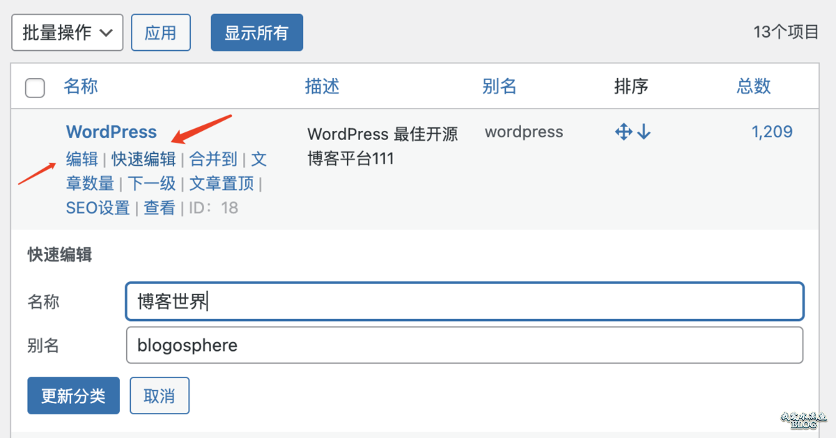 WordPress 后台默认分类列表页,有「编辑」和「快速编辑」这两个按钮,先说简单的,点击「快速编辑」按钮则可以修改分类的名称和别名,其他都不能修改: