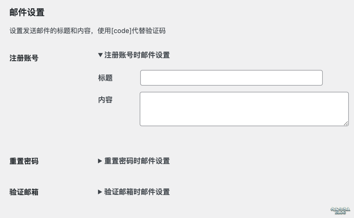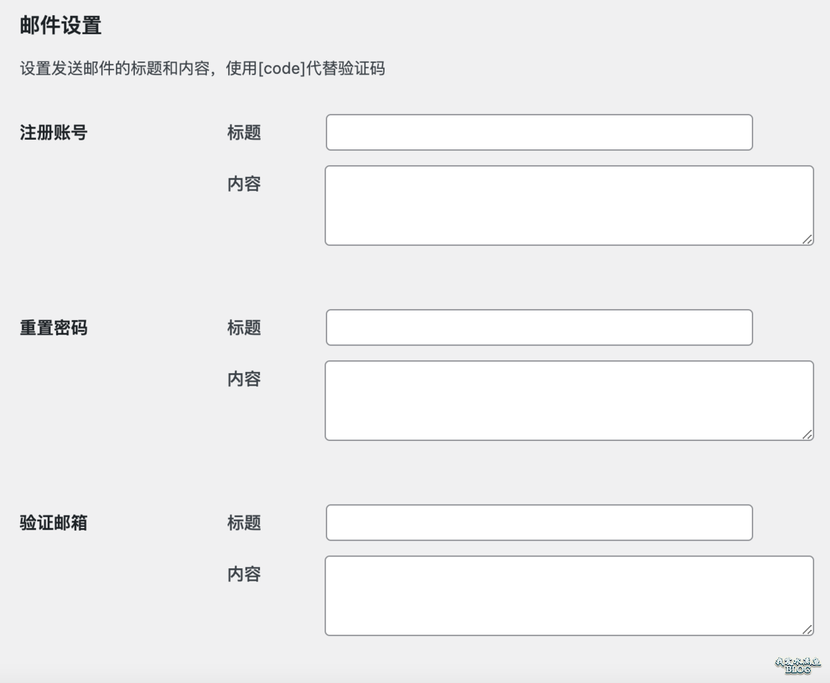 可以定义「注册账号」,「重置密码」,「验证邮箱」等各种情况下的邮件模板的标题和内容。使用 WPJAM Basic 的生成表单功能,实现是非常简单,具体的代码就是生成三个 fieldset 字段组,使用 foreach 简单就能处理: