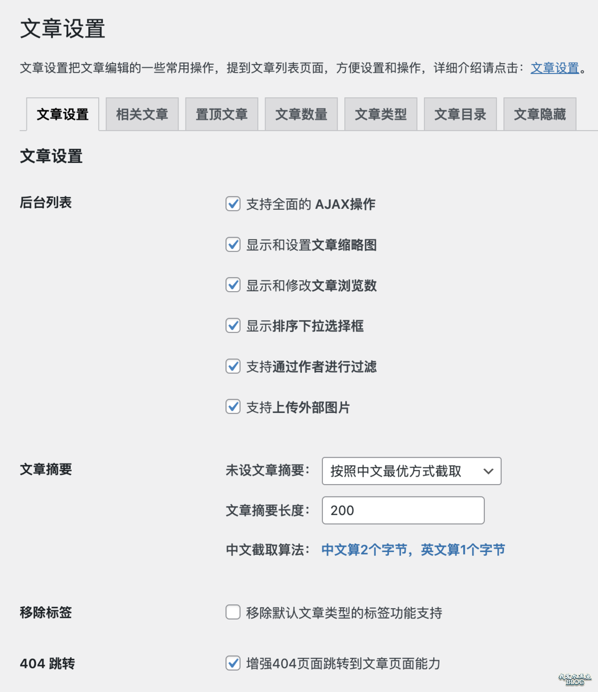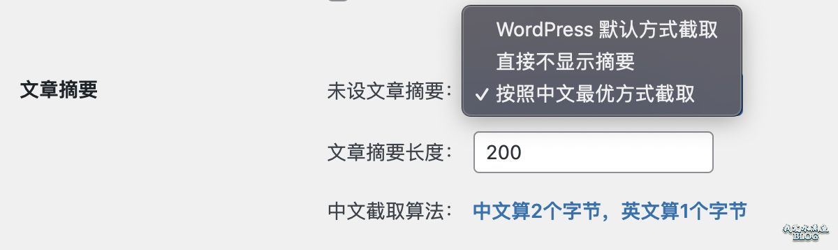 所以对于中文环境,最好按照「中文 2 个字节,英文 1 个字节」的方式来截取,为了方便大家的设置,我在 WPJAM Basic 集成了自动获取文章摘要的设置,无需修改任何代码,简单选择设置一下即可: