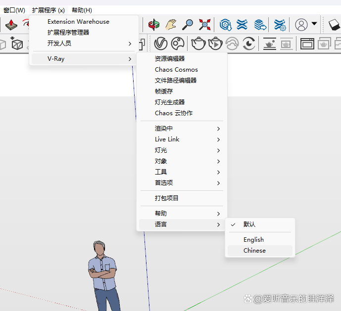 9、安装后打开 SKetchUp 点击扩展程序——V-Ray——语言——Chinese, 勾选即可切换中文。