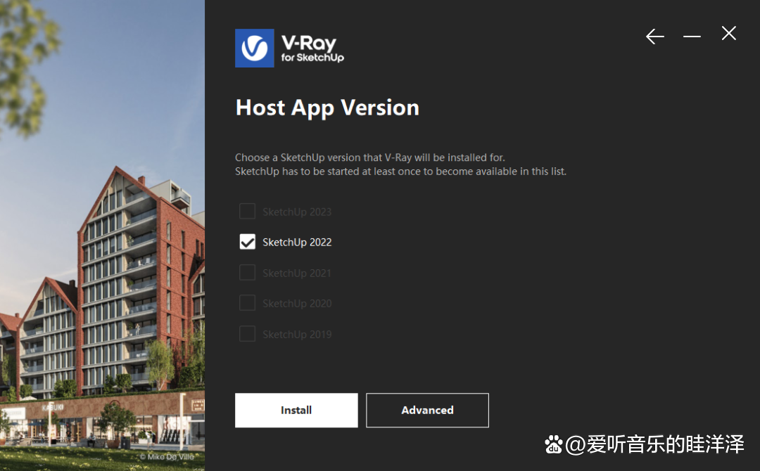 3、这个页面会显示目前电脑设备对应的SKetchUp 版本, 如果电脑没有安装Sketch Up则无法安装VRay VRay6.02 支持SketchUp 2019-2023 然后勾选需要安装的Sketch Up即可 点击Install