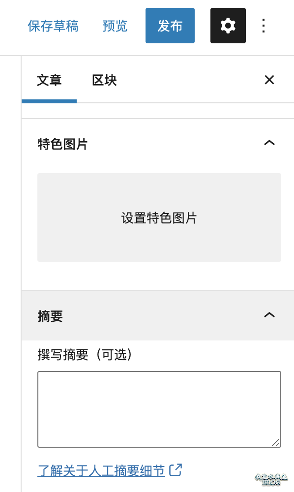 但是升级到古腾堡编辑器之后,很多人就发现不知道去哪里设置摘要了,摘要设置文本框被移到编辑器右侧文章设置的很下面,很多人没有认真去翻以为没了。