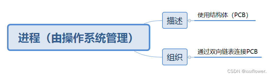 句柄(handler):系统中包含很多的软件资源,写代码就需要用到一些软件资源。软件资源是在操作系统内核中,在应用程序的代码中,不方便直接操作。句柄,就相当于一个遥控器(简单的整数。编号)通过系统调用这个句柄就可以操作软件资源了。 进程是一个很重要的“软件资源”。是由操作系统内核负责管理的。 而这种管理是以描述+组织的形式。描述是讲清楚都有哪些属性特征。组织是通过一定的数据结构,把多个这样的单位穿起来。 描述:使用结构体(C语言的结构体)来描述进程属性。这个结构体,叫做PCB(进程控制块)。 组织:通过双向链表。来把多个PCB串在一起。(注意,不是一个单纯的双向链表)