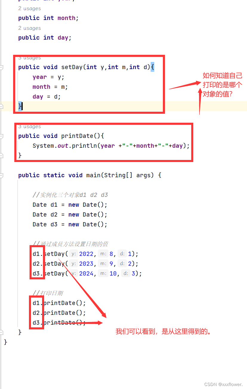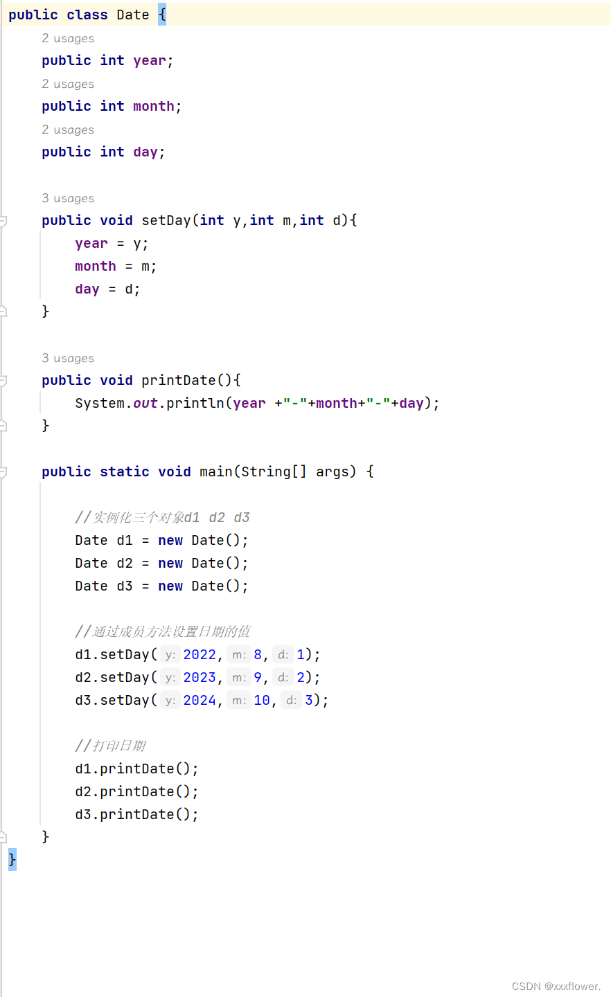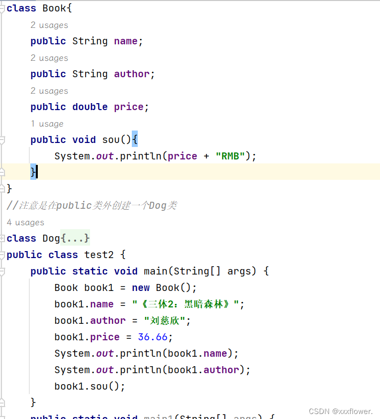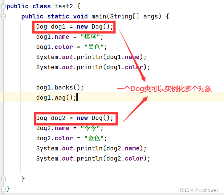 定义了一个类,就相当于在计算机中定义了一种新的类型,与int,double类似,只不过int和double是java语言自带的内置类型,而类是用户自定义了一个新的类型,比如上述的:PetDog类和Student类。它们都是类(一种新定义的类型)有了这些自定义的类型之后,就可以使用这些类来定义实例(或者称为对象)。 用类类型创建对象的过程,称为类的实例化,在java中采用new关键字,配合类名来实例化对象。