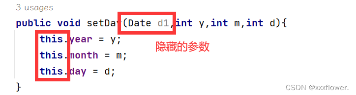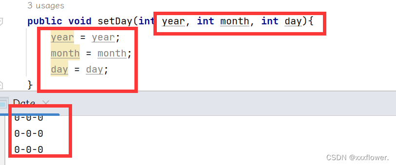 这是因为当形参名和成员变量名相同时,编译器会认为这是同一个值,**C语言中规定局部变量优先,只是形参自己给自己赋值了,根本没有赋值到成员变量中。**所以打印的值为默认的值。0