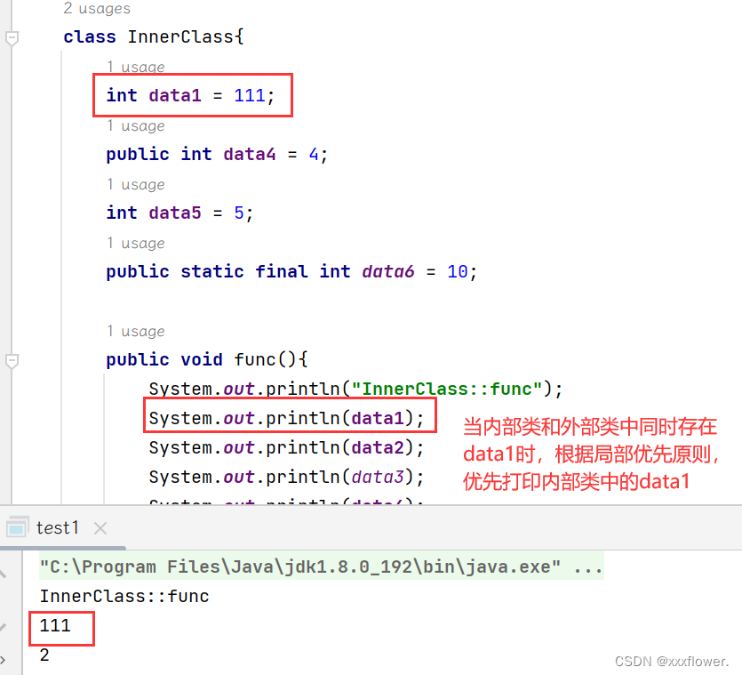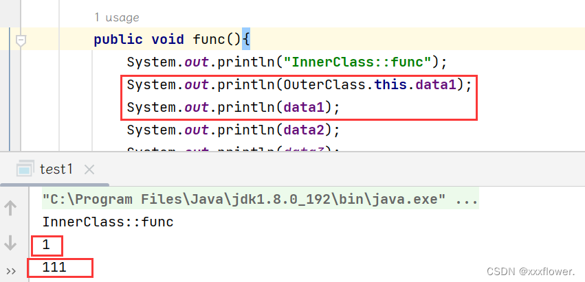 3.在实例内部类当中,如何访问外部类当中,相同的成员变量? 如果想在内部类中使用外部类的data1,则修改代码: 类名.this.外部类成员 即可