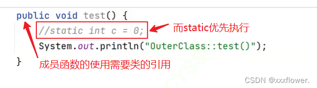 成员函数的执行需要外部类对象的引用,static属于类的成员,类加载的时候static就可能会被执行
