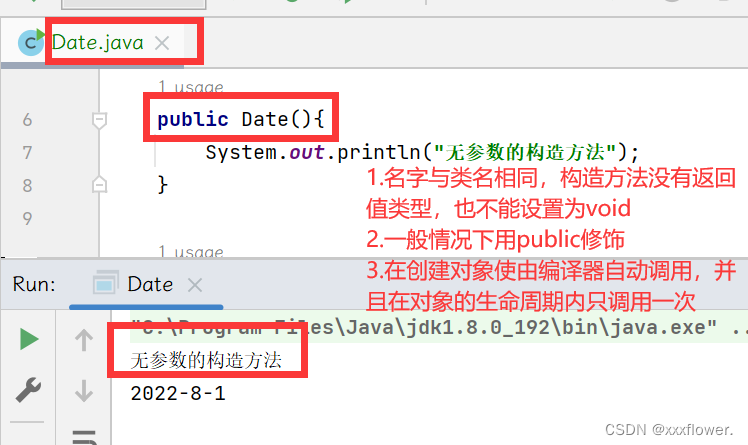 构造方法(也称为构造器)是一个特殊的成员方法,名字必须与类名相同,在创建对象时,由编译器自动调用,并且在整个对象的生命周期内只调用一次。