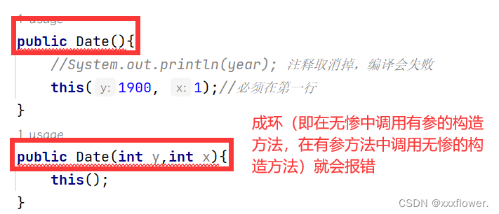 注意: this(…)必须是构造方法中第一条语句 不能形成环