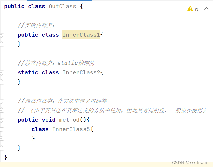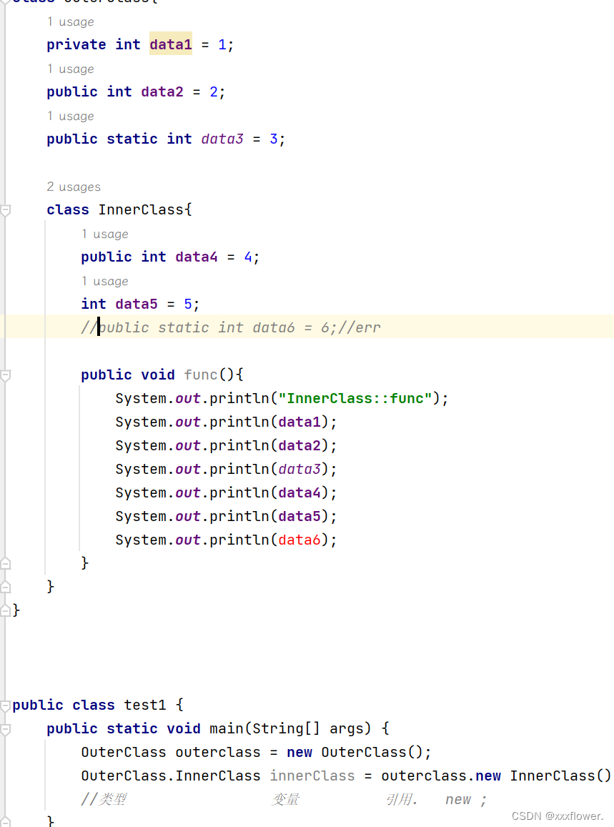 System.out.println(outerClass.data1);定义在外部类的方法体或者{}中,该种内部类只能在其定义的位置使用 【注意事项】