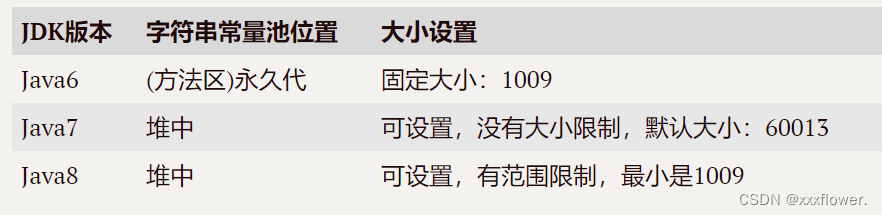 字符串常量池在JVM中是StringTable类,实际是一个固定大小的HashTable(一种高效用来进行查找的数据结构, 后序给大家详细介绍),不同JDK版本下字符串常量池的位置以及默认大小是不同的