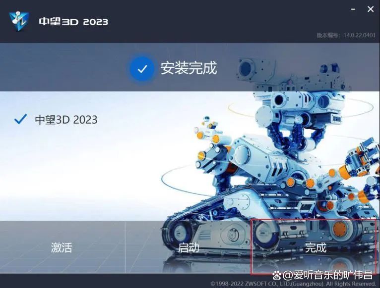* 不要点击“激活”和“启动”。此时许可证信息还没写进系统! 8、关闭安装程序后,会弹出一个对话框,表示激活完毕。此时可以正常使用中望3D了。 * 有小概率会出现激活失败的情况。 9、双击桌面的“中望3D”快捷方式,即可启动程序。