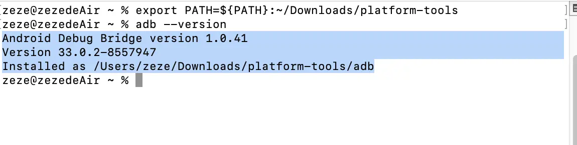 export PATH=${PATH}:~/Downloads/platform-tools(输入完网上说关闭终端在打开就行了,但实际上就是关闭了这个命令就无效了,所以请不要关闭终端,直接按照下面的流程走,如果关了也不要紧重新输入一遍就行了)