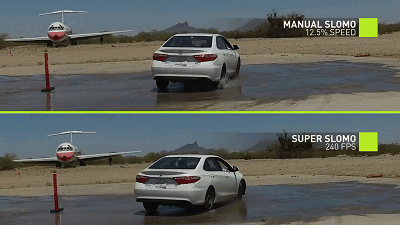 上图来自另一 AI 补帧工具 SUPER SLOMO 的示例,将原片 30 FPS 的汽车甩尾镜头放慢 8 倍后,实际 FPS 不足 4 FPS,肉眼可见的卡顿。而通过 AI 补帧技术,能够将慢放后的视频维持在 240 FPS,流畅程度可见一斑。
