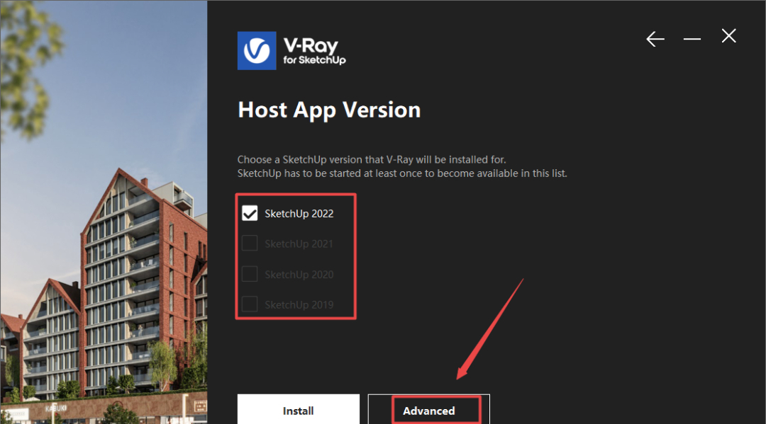 4.安装程序自动识别SketchUp版本,点击“Advanced“