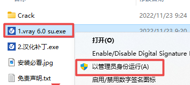2.打开刚刚解压的文件夹,鼠标右键点击“1.vray 6.0 su.exe”选择“以管理员身份运行”