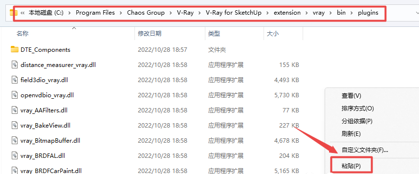 16.依次打开文件夹路径“C:\Program Files\Chaos Group\V-Ray\V-Ray for SketchUp\extension\vray\bin\plugins”,在打开的文件夹空白处,鼠标右键“粘贴”刚才复制的“vray_BRDFScanned.dll”文件