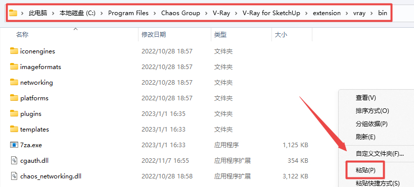 13.依次打开文件夹路径“C:\Program Files\Chaos Group\V-Ray\V-Ray for SketchUp\extension\vray\bin”,在打开的文件夹空白处,鼠标右键“粘贴”刚才复制的“cgauth.dll”文件