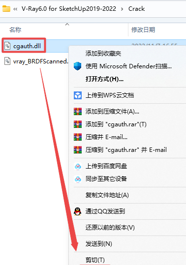 12.返回之前解压的“V-Ray6.0 for SketchUp2019-2022”文件夹,双击打开“Crack”文件夹,选中“cgauth.dll”文件,鼠标右键选择“复制”
