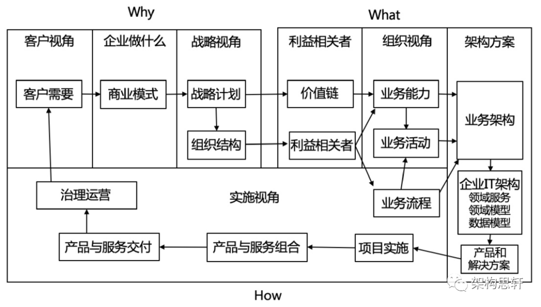 我们再通过图4来看看这些概念之间的关系。从战略角度主要回答Why,客户需要什么,企业通过商业模式回答要做什么,战略计划是什么,并伴随着组织结构的设定。业务架构主要回答What的问题,通过对战略计划的分解,产生价值链,并进而分析出业务能力及业务流程,业务能力关注结果,业务流程关注过程,再结合核心的业务活动,进而产出业务架构。从架构视角来看,业务架构是企业IT架构的输入,领域服务、领域模型、数据模型等都是企业IT架构的范畴,进而从方案视角设定企业产品和解决方案。之后,通过实施视角回答How的问题,也就是通过项目落地实施,产出产品与服务的具体组合,进而交付给客户,同时经过治理运营进行持续的迭代优化。