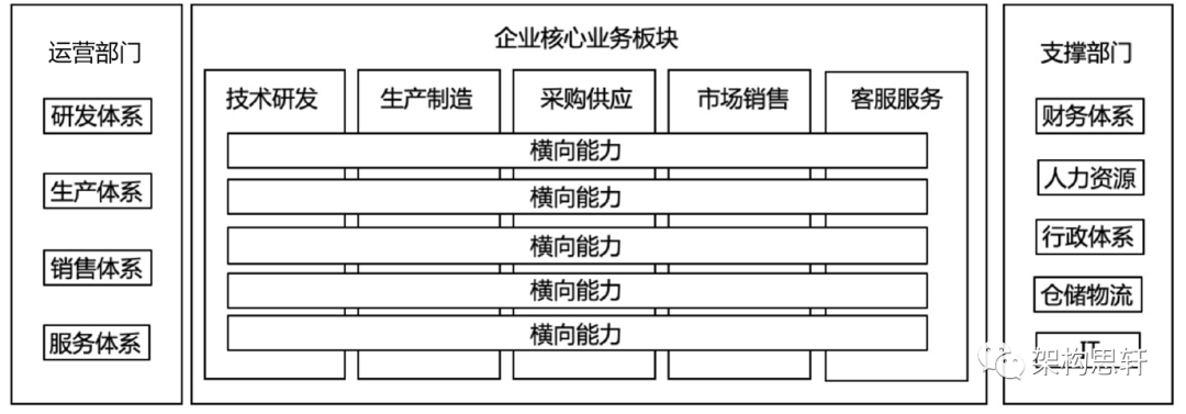 广义的业务架构与企业的业务板块和组织结构有密切的关系,既涉及企业的核心业务板块,如技术研发、生产制造、采购供应、市场销售、客服服务等纵向业务,又涉及支撑企业日常运营的运营部门和财务、人力、行政、仓储、IT等支撑部门的横向业务(见图1)。业务架构可以明确企业人员、资金、信息化、服务等企业资源如何进行部署和分配。